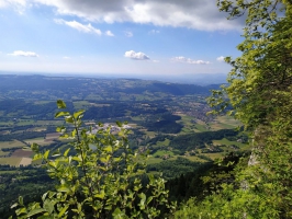 (6) Depuis la prairie, descendre en direction du nord-ouest, vers le « Pertuis ». Le sentier contourne le vallon du ruisseau de Courbière par la gauche puis redescend sur la droite en forêt jusqu’à « la Cellière ». À l’intersection prendre à droite le long de la piste forestière en direction du « Pertuis ». Un rapide aller-retour au belvédère offre une nouvelle vue sur le monastère de la Chartreuse de Currière et la Grande Sure. Continuer la descente sur la route forestière en passant par le « Pas du Pertuis » et « la Pointière » et poursuivre jusqu’à la Revira. Suivre la direction « Le Désert » jusqu’au point de départ.