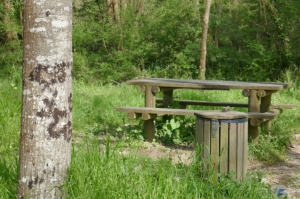 Après le pont sur le Luy de Béarn, empruntez un chemin agricole qui vous mènera à une aire de repos. Traversez la route goudronnée et continuez sur le chemin agricole.