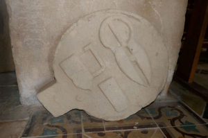 Stèle présentant un décor de marteau et d’enclume sur la face déposée dans l’église. Reconstruite entre 1896-1901 et abritant 6 verrières.