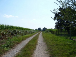 Prendre de nouveau à gauche vers l’alignement de chênes, tourner à droite après avoir franchi le ruisseau, puis de suite à gauche après le bosquet pour remonter vers la route. Au contact du goudron, prendre à droite sur 170 m puis la piste en terre à gauche menant vers Garlède entre les parcelles de maïs.