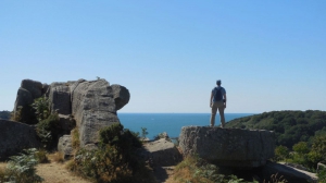 La butte, que nous vous invitons à gravir, correspond à l’ancien rempart de terre et de pierres sèches construit avant la conquête romaine (Ier siècle avant J.-C.). Pour désigner ce type de promontoire côtier délimité par un rempart, les archéologues parlent d’éperon barré. Ce mur imposant avait un rôle défensif contre les attaques terrestres, mais aussi politique, symbolique et pratique, car il servait de soutènement et de protection contre le vent.