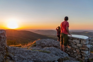 Point 3 : Au roc des Écus, tourner sur la crête à gauche. Avancer tout droit. Descendre sur une large piste. S’y engager à main gauche. À la première patte d’oie en début de forêt, aller à gauche (séparation avec les GR® de Pays des Monts et Lacs en Haut-Languedoc et GR® de Pays des Hautes Terres d’Oc).