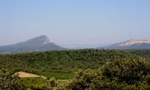 > Accès à un point de vue (50 m) : monter à droite (point de vue sur la plaine, le pic Saint-Loup, le château de Montferrand, le plateau de l’Hortus), puis revenir sur ses pas.Descendre le sentier ( descente raide).