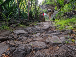 ITINERAIREDepuis le bureau d’informations touristiques de Saint-Leu, tournez à droite au rond point nord afin d’accéder au parking de la Grande Fontaine (lieu de concert "La Ravine"). Le sentier commence sur la gauche, par des marches d’escalier. Vous traversez la ravine asséchée et rejoignez très vite le sentier pavé datant de 1760. Au début du sentier, la "roche cercueil" nous rappelle que : de 1950 à 1970, les cercueils des défunts étaient transportés à tête d’homme, des hauts de Saint-Leu jusquà la ville afin de les ensevelir au cimetière de Saint-Leu. Cette roche était le lieu où l’on déposait le cercueil afin de permettre aux porteurs de reprendre leur souffle. Au bout d’une montée de dix minutes, tourner à gauche et vous voilà arrivés à la "Batterie des Sans Culottes" construite en 1794 et qui notamment a servi à la défense de la ville pendant l’invasion anglaise en 1809. Il faut revenir sur vos pas pour continuer le sentier. Les pavés qui jonchent le sentier disparraissent au fur et à mesure de la montée. A la prochaine intersection, continuez le sentier sur la droite jusqu’au point de vue nommée "La Roche Pâté". En haut du sentier, trouner à droite. Emprunter la piste de scories à droite qui vous mènera à un magnifique point de vue où vous pourrez découvrir le vol vertiginuex du "paille en queue" dans la ravine de la Fontaine (Attention : ce point de vue se trouve sur un terrain privé, il est important de demander l’autorisation aux propriétaires avant d’y accéder). Revenez sur vos pas, pour passer sous la route desTamarins et rejoindre le sentier. Marcher pendant 3/4 heure et dirigez vous tout droit (flèche verte sur la roche) vers un chemin de terre avant d’arriver sur une route bitumée "chemin d’eau".A mi parcours, prenez le temps d’une petite pause sous le manguier pour admirer le lagon de Saint-Leu. Prenez à gauche en passant devant l’école maternelle de la Grande Fontaine afin de rejoindre le "chemin surprise" (arrêt Kar’Ouest : "maison 58") au point d’arrivée.Pour rejoindre la côte, vous pouvez effectuer le retour par le même sentier, ou prendre le Kar’Ouest qui vous déposera à côté de la mairie de Saint-Leu (ligne 62 - Arrêt: Maison n°16). Quelques espèces de végétation sèche des bas que vous trouverez sur ce sentier :Le Tamarin des bas (Tamarindus Indica)L’affouche bâtard (Ficus reflexa)Aloes (Aloe barbadensis miller), localement appelé "laloués-amer"Le choka bleu (agave vera cruz)Le benjoin (Terminalia bentzoë)Le bois de reinette ou bois d’arnette (Dodonea viscosa)