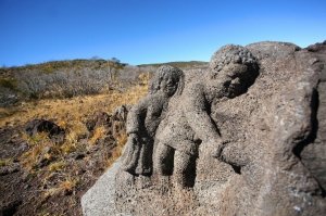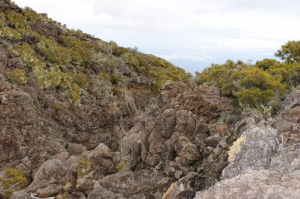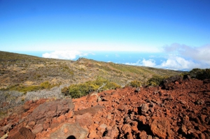 ITINERAIRE Maïdo (2203m), la Glacière (2489m), Piton Rouge (2401m), route forestière du Piton Rouge (1820m). Avant de débuter notre randonnée, on va faire un petit détour par le belvédère du Maïdo, d’où on surplombe Mafate et ses divers "ilets", les thèmes abordés seront l’histoire et le peuplement du Cirque, très lié à celle de François Mussard, la première personne en 1700 à obtenir une concession entre le Ravine Trois-Bassins et Grande Ravine dans l’actuelle commune de Trois-Bassins. Cellle-ci possède au sommet de ses montagnes, les sites du Grand Bénare et de la Glacière qu’on atteint au bout de 2h de marche. A certaines périodes, la glace peut recouvrir en partie le chemin (Bénare vient du malgache, qui signifie grand froid). Les trois puits construits au siècle dernier à l’aide de pierres. On y stockait la glace qui se formait naturellement dans les basssins; Elle était ensuite acheminée à dos d’homme dans les sacs ou pilés en pains de 25kg, le long du chemin dit de la Glacière jusqu’à la Maison des Villèles chez Mme Desbassyns. Deux heures de marche supplémentaires pour rejoindre la Caverne du "roi Phaonce" caverne supposée avoir servie d’abri à l’esclave marron Phaonce et tombe supposée être également la sienne. Cet ancien roi des marrons avait ses gardes, sa hiérarchie, et rendait lui-même sa justice. On entame l’ascention du Piton Rouge (2401m), le sentier qui y mène au site poursuit dans un paysage désertique et rocailleux (sol basaltique). De là, on peut admirer des bas-reliefs du sculpteur Gilbert Clain rendant hommage aux marrons. L’épopée des marrons marque l’histoire des hauts de l’Ouest de la fin du XVIIème siècle à l’abolition de l’esclavage de 1848. Epris de liberté en fuyant la cruauté de leurs maîtres, les esclaves "partaient marrons" dans des lieux difficilement accessibles; Ils ont leur chef, leur organisation. La descente jusqu’au camp du Piton Rouge traverse un paysage assez pittoresque formé de végétation arbustive composée notamment de tamarins des hauts, de branles (fausse bruyère) et de "petit tamarin", avec par endroit des clairières cela jusqu’à la route forestière du Piton Rouge. PRATIQUE : Prévoir deux voitures, une au début du sentier du Maïdo et une à l’arrivée au sentier du Piton Rouge. Si vous n’avez pas de deuxième voiture vous pouvez appeler un taxi pour venir vous chercher à la fin de votre randonnée. Vous pouvez aussi faire cette randonnée accompagné d’un guide.