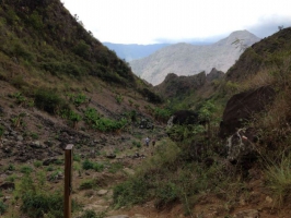Le sentier débute par une descente de 100 mètres de dénivelé environ, avant de traverser la ravine du Maïdo.