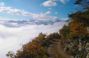Au cairn, monter par le large chemin à gauche. Il s’élève en grands lacets dans la forêt et arrive près de la crête.