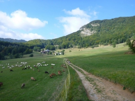 Le chemin contourne une barre rocheuse par la droite et mène au sommet où s’ouvre une vue imprenable sur le massif de Chartreuse. 8/ Après avoir traversé le mont Joigny, un petit sentier redescend raide en forêt. À « Devant Joigny » (1 490 m), prendre à droite en direction des « Ravines ». Arrivé en bas de la descente, retrouver le chemin des granges de Joigny. Le reprendre à gauche pour rejoindre le col du Granier.