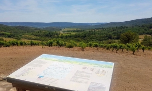 Juste après le Col de la Pierre Blanche, vers le kilomètre 10, vous pouvez d’ailleurs emprunter un chemin rocailleux qui monte aux tables d’orientation. Étonnantes au cœur du vignoble et au nombre de 4 (une pour chaque point cardinal), elles offrent un point de vue original sur le massif du Caroux, qui avec le recul prend la forme d'une femme allongée, "Cebenna". Ces tables vous donnent des clés pour déchiffrer les paysages, les spécificités des terroirs et l'environnement géologique.