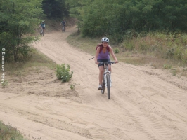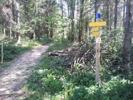 Prendre à gauche, puis traverser la D121 pour emprunter le large chemin en face. Contourner le "stock car" puis monter dans le bois.