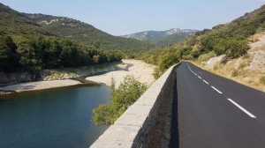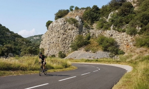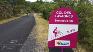 C’est au pied de Pégairolles que vous entamez la difficile ascension du col des Lavagnes, un peu plus de 6 km de montée pour 370 m de dénivelé environ… Le revêtement est granuleux, la route étroite et sinueuse, les portions de pente irrégulières, avec des passages fréquents entre 8 et 10%. Si vous ajoutez à ça la chaleur d’un soleil d’été, vous comprenez pourquoi nous parlons d’une ascension difficile. L’effort est largement compensé par la beauté du panorama. Vous remontez une vallée encaissée dans la forêt domaniale de Saint-Guilhem-le-Désert. Les oliviers qui bordent la route laissent rapidement place aux garrigues et aux roches. Une fois au sommet, vous êtes un peu au bout du monde…