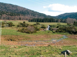 Cheminer dans un sous-bois clair à proximité de la prairie. A l’angle, au croisement de la "Foire aux Fayards", (alt. 1117m), monter à gauche sur un sentier entre deux plantations de résineux. Plus haut le chemin s’infléchit sur la droite.