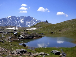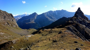 Au départ du col de la Chail (2 457 m) qu'on rejoint en descendant depuis l'arrivée du télécabine Transarc (venant d'Arc 1 800 ). Sentier vers l'Est, à flanc de coteau vers le lac des moutons (2 574 m). Trouver le chemin un peu discret au début qui part tout droit en amont vers le Grand Col. Le sentier arpente une moraine sous un télésiège. La beauté de la flore pionnière pallie à cet inconvénient. Au col (2 935 m) : une cabane arrimée à la montagne par des câbles. Très belle vue sur un lac glaciaire sur Villaroger. Ce col autrefois fort fréquenté est impraticable depuis la fonte du glacier et un éboulement. Monter vers l'Est sur 200 m pour voir le glacier de près. Attention moraine instable et chutes de pierres ! Retour par le même chemin.