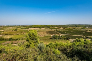 Monter à gauche la piste sur environ 500 m, puis traverser une autre piste : la Voie Domitienne (ancienne voie romaine). À la patte d’oie, aller à gauche puis à l’intersection, s’engager à droite. Au niveau d’un mazet (petite construction), longer à droite une vigne, puis emprunter à gauche un sentier dans la pinède. Cheminer à l’ombre des pins sur 700 m et retrouver une piste. L’emprunter à droite et découvrir un point de vue sur les vignobles et les villages du centre Hérault avec, en fond, les Avant-Monts (tables d’orientation). Suivre cette piste jusqu’au bout de la vigne, puis remonter légèrement à gauche avant de bifurquer à droite dans la pinède sur environ 300 m.
