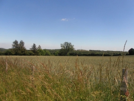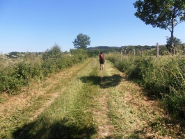 2/ Monter à gauche, puis à 30m à droite sur un chemin entre deux pâturages. À la jonction avec un autre grand chemin, descendre en face sur 100 m puis monter à gauche. À la D 413, continuer en face. Au croisement en T, prendre à droite sur quelques mètres jusqu’à un autre croisement.