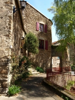 5/ Quitter le chemin pour suivre cette sente qui descend perpendiculairement à droite, puis 300 m plus loin prendre à gauche sur 400 m. Tourner à droite sur le petit sentier escarpé qui descend face au village. À la croix, prendre la route sur la droite et traverser le village pour revenir au point de départ.