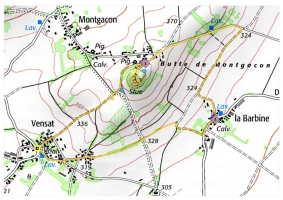 3/ Tourner à droite sur la D43B et 300 m plus loin prendre un chemin à droite qui remonte en direction de la butte. Ignorer un chemin à gauche et 50 m plus loin à un croisement en T prendre le chemin de gauche. Continuer tout droit pour revenir à Vensat (métier à ferrer à l’entrée du bourg) et rejoindre la place (lavoir, four à pain et pigeonnier).