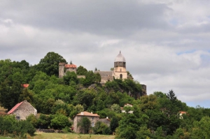 4/ Sortir par le porche, contourner par la droite la petite tour et l’église (oppidum). Descendre le sentier à gauche le long de la clôture. Au croisement dans le bois virer à droite. À la sortie du bois tourner à gauche. En vue du ruisseau de Gripet prendre à gauche et passer le pont. Monter dans le village de Tourzel. À la fourche prendre les escaliers à gauche et tourner tout de suite à droite. Traverser le village par la rue du Dauphiné d’Auvergne jusqu'à une fourche à la sortie.