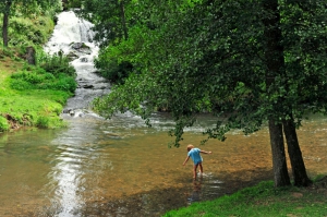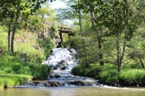 3/ Franchir la Sioule et monter sur le pont au dessus de la cascade. Poursuivre sur le chemin à gauche et, à la croix, continuer à gauche jusqu’au point de départ.