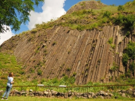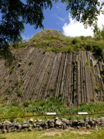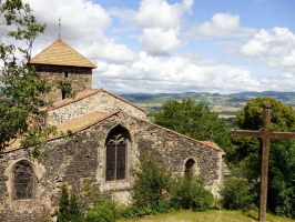 4/ Traverser la route et passer devant le transformateur et se diriger vers le village d'Usson. Face à la croix et la fontaine, partir à droite. Au mur d’enceinte, s’engager sous le porche, puis à gauche (aire de pique-nique). Suivre la petite route passant entre les maisons. À la vue de la croix s’engager sur le sentier à droite et gagner le sommet du village d'Usson (au château d’eau, belles orgues basaltiques). Aller jusqu'à l’église romane (panorama sur le massif du Sancy et le Cézallier).