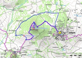 5/ Prendre à droite, puis laisser celui-ci et continuer tout droit . Traverser la route de Florat et continuer en face sur le chemin herbeux. Sur le trajet laisser le chemin de droite. Au croisement sous la ligne électrique monter à droite. Au sommet descendre tout droit sur Solignat.