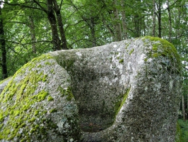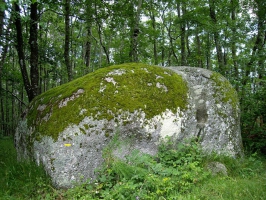 3/ Dans le virage à gauche, suivre la route en face devenant chemin après la maison. À la fourche, prendre à gauche en sous-bois jusqu’au replat. Au croisement monter à gauche. Au Rez de Sol (filon de quartz, table d’orientation, panorama méridional), suivre le sentier à gauche des crêtes ; il passe à droite et redescend entre 2 gros blocs. Au chemin, monter à gauche et poursuivre en face.