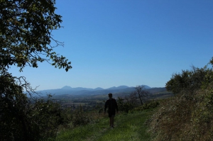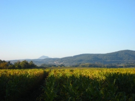 2/ Obliquer à gauche (vue sur le puy de Dôme). Poursuivre tout droit entre vignes et vergers jusqu'à la route goudronnée. L'emprunter à droite sur 50 m (vue sur Combronde) et virer à droite dans le premier chemin. Au croisement, poursuivre en face jusqu'à la fourche.