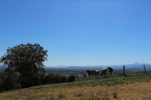 3/ Monter à gauche. À l’intersection en T, partir à droite. Au croisement, poursuivre la montée en face et prendre le premier chemin à gauche. Prendre à droite et faire l’AR (50 m) au sommet du puy de l’Oule, par le même chemin un peu pentu (panorama sur la chaîne des Puys, les Combrailles, la plaine de la Limagne, la Montagne bourbonnaise, le Livradois-Forez et le plateau de Gergovie). Repartir à droite. Ignorer le chemin de droite, passer sous la ligne à haute tension et avancer jusqu'à l’intersection suivante en T face au verger.