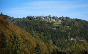 2/ Emprunter la rue à droite. Laisser l’église (PP1) à gauche, la mairie à droite puis deux maisons à gauche avec fours à pain attenants. À la sortie en haut du bourg, prendre en face une route sur 300 m. (PV1 : point de vue sur les gorges de la Burande et, au lointain, le Sancy et les monts Dore) jusqu’à une intersection au niveau d’une ferme.