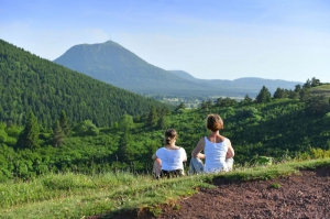 - Panorama sur les monts du Cantal, le Sancy, le Forez et la Chaîne des Puys ainsi que le lac d’Aydat.