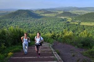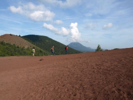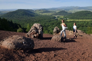 4/ Monter en face (chemin aménagé) jusqu'à la lèvre du volcan (vue sur les puys de la Mey et de Dôme, le château et l’étang de Montlosier). Progresser à gauche sur des scories rouges jusqu'au sommet du puy de la Vache (1 167 m) (vue panoramique sur les puys, le Sancy, le Cézallier et le Livradois). Rejoindre le début des escaliers de descente.