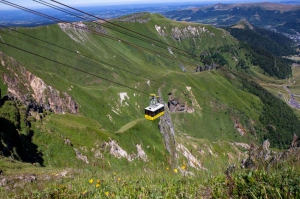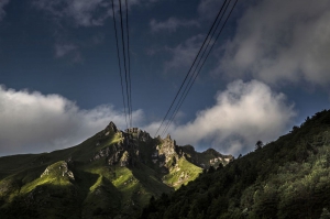 10/ Monter tout droit, à gauche de l’arrêt navettes, puis tout de suite à droite puis encore à gauche. Continuer tout droit jusqu’à une intersection avec un large chemin au niveau du TS luge d’été. L’emprunter à gauche, pendant 50m. Monter à droite en suivant toujours la direction Puy de Sancy. La sente est d’abord parallèle au parcours de la télécabine puis passe dessous. Prendre aussitôt sur la droite un petit escalier puis un sentier progressant dans un bois. Après celui-ci, continuer tout droit jusqu’à un large chemin. Le suivre à droite. Dépasser une cabane d’arrivée TS. Passer sous le câble de la tyrolienne et, aussitôt après, prendre à gauche, dans un bois, un escalier long et raide, rejoignant le départ de la tyrolienne. Continuer tout droit. Laisser à droite une arrivée de TS. Poursuivre sur un large chemin à gauche. 15m après la première grande barrière anti-neige située sur la droite, monter à droite. Le sentier s’oriente progressivement vers la gauche en direction d’un col. Passer sous les câbles de la TC puis d’un TS pour atteindre, à hauteur d’une grande barrière anti-neige, située sur la droite, un large chemin (vue sur les lacs Pavin et Bourdouze, les Monts du Cantal, du Cézallier, de la Margeride du Forez). Continuer à droite pour rejoindre le col du Couhay. Poursuivre la montée, à droite, sur un large chemin jusqu’à la première intersection.