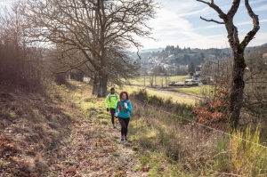 1/ Depuis le bureau de poste de Pontaumur, dirigez-vous vers la mairie par la rue Paul-Chassaing. Au stop, au niveau de la route principale, tournez à droite pour traverser le pont qui surplombe le Sioulet. Juste après celui-ci, tournez à droite sur la rue de Niederwerth. Traversez la Saunade avant de prendre à droite, dans une impasse, une centaine de mètres plus loin. Vous suivez ici un itinéraire bleu qui est peu visible, faites alors confi ance à la trace GPS. Empruntezle chemin qui vous amène devant des bâtiments agricoles. Sur votre gauche, un chemin monte en balcon, prenez-le et suivez-le jusqu'au village des Bouchons.