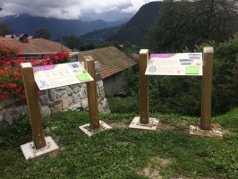 Topo pas à pas : Mairie – Chapelle de la Fley : 10 minutes A partir de la mairie de Nancy-sur-Cluses, prendre la route qui vient de Cluses. Avant la sortie du village, suivre la petite route qui part sur la gauche, en suivant la pancarte "la Chapelle Tour des Crêtes ». La route goudronnée devient alors un chemin qui surplombe le village, poursuivre sur celui-ci jusqu’à la chapelle de la Fley en suivant les poteaux de la Chouette Eliot. De la Chapelle de la Fley à la Frasse : 45 minutes Une fois arrivé à la chapelle, emprunter le chemin raid sur 200 mètres. Il monte sur la gauche tout de suite après celle-ci (ne pas continuer tout droit). Après la montée, au croisement des chemins, partir sur la droite. Poursuivre jusqu’au pylône électrique et profiter de la vue dégagée sur Cluses à votre droite. On arrive à une intersection, prendre alors à gauche en suivant la direction Nancy par les Crêtes (peinture jaune). Longez le bois et reprenez la montée sur 100 mètres. A l'intersection suivez la route carrossable à gauche en prenant la direction Nancy (peinture jaune). Descendre jusqu'à rejoindre la route départementale que vous traversez pour suivre la direction "le Moulin". Continuer votre descente sur la route goudronnée jusqu'aux habitations. De là au carrefour, prenez sur votre gauche pour rejoindre le village de la Frasse. Vous allez passer successivement devant le remarquable grenier restauré, des anciennes maisons de colporteurs avec le chiffre 4 décorant le dessus des portes, les fours jumeaux et la chapelle de la Frasse. De la Frasse à la mairie : 5 minutes Après la chapelle continuer sur votre droite pour rejoindre le parking et l'Eglise de Nancy-sur-cluses.