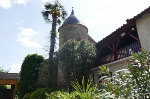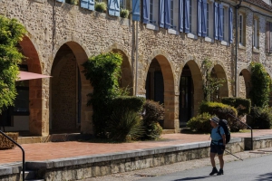 A la 2e intersection, remontez par la lande sur votre droite jusqu’au château d’eau. Vous tombez en haut de la côte goudronnée sur les arènes du Soubestre. Longez le collège et rejoignez la place du Marcadieu puis celle de la République avec ses arcades, son église et la tour de Peich.