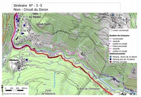 Depuis le parking à proximité des thermes, prendre l'accès piéton en direction du supermarché, poursuivre jusqu'à la base de rafting. Sous le chalet, en bordure de route, prendre la direction de la déchetterie de l'île Ferlay. Vous accédez à une passerelle en 15 minutes.2 options : - aller à Brides-les-Bains (1h de marche env.) - prendre le chemin qui remonte en direction du chemin du Plan, puis l'avenue du Château pour rejoindre Salins-le-Haut (attention, forte pente pour cette seconde possibilité).Choisir la 1ère option et poursuivre le sentier jusqu'à Brides-les-Bains.Si vous en avez le temps, prévoyez de visiter la station thermale (parc / buvette / centre de la station ....).Si le temps vous manque, prendre directement la route à gauche et traverser le pont Simon en direction du hameau de Fontaine.Environ 200 mètres après les dernières maisons de Fontaine, prendre le sentier sur la gauche qui permet de rejoindre Salins et de boucler la boucle.Suivre la signalétique permettant de regagner la passerelle du Doron en contrebas puis le Parking.Alt min : 489 mAlt max : 649 m