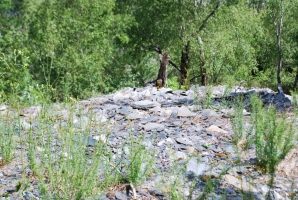 Anciens tunnels d'exploitation des ardoisières reliés par des chemins formés pour les charettes de transports. Des cascades d'ardoises bleu et grise ponctuent le site, ce sont les résidus des découpes.