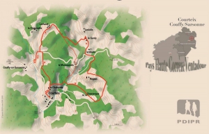 Deux points de départ possibles, la mairie de Couffy-sur-Sarsonne ou l’église de Courteix, à partir desquels on rejoint la boucle principale par un aller-retour. La région a été marquée par la présence des Templiers (présence de tombes templières dans l’église de Courteix) mais aussi par la seigneurie de Châteauvert (tombe médiévale dans l’église de Couffy). Au Bois des Trois Faulx, la stèle du maquis, et à proximité les sapes (abris sommaires servant de cachettes) de maquisards récemment reconstituées, rappellent l’engagement des Résistants. Ce circuit offre une succession de vues dégagées sur le Plateau de Millevaches et les Monts d’Auvergne, de passages en sous-bois et de traversées de villages typiques de la Haute-Corrèze.Variante de 9km d'une durée de 2h30.