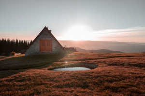 2/ À la 3ème pause, le chemin monte vers une autre jasserie. Suivre la piste jusqu’à la jasserie rénovée. Passer à droite d’un bassin et emprunter un sentier herbeux se dirigeant vers une nouvelle jasserie. Tourner à droite juste 20 m avant celle-ci. Reprendre un chemin plus important à gauche et le laisser à 100 m pour virer sur un chemin herbeux à droite. Il se dirige vers un bois d’épicéas.
