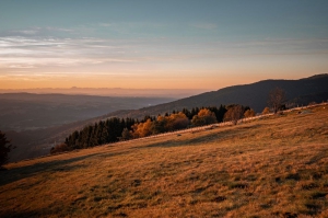 1/ Au bout du parking en montant vers le col, prendre à droite après une mare, puis tout de suite à gauche, un chemin qui longe la route (1ère pause). Monter en face, le chemin tourne à droite. Aux deux pattes d’oie suivantes, emprunter le chemin de droite. À la lisière de la hêtraie, prendre le chemin qui descend à gauche. À l’intersection, descendre la piste à gauche jusqu’aux jasseries des Supeyres (2ème pause). Continuer sur ce chemin.