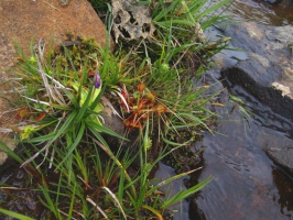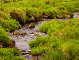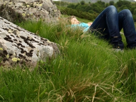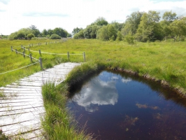 3/ L’emprunter à gauche sur 30 m et virer à droite (ENS tourbière de Jouvion,) en suivant la clôture puis en empruntant une longue passerelle sur la tourbière. Continuer à droite jusqu’à la zone humide suivante (informations sur la faune, la flore et la restauration de l’ENS). Traverser le ru, monter à droite, poursuivre sur le chemin entre les murets (deux escabeaux), puis suivre à droite une petite route sur 300 m. À la départementale, aller à droite et, 100 m plus loin, prendre à gauche la direction de Fontlade . Continuer tout droit jusqu’à une route (ferme Bertinet en contrebas).