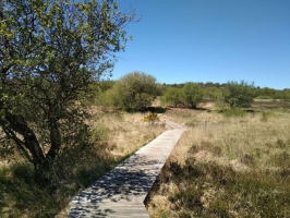 Emprunter le premier sentier à droite, sous une futaie de pins. Il traverse un paysage de landes et franchit des tourbières (zones humides aux eaux acides et stagnantes, abritant des espèces animales et végétales spécifiques ; panneaux d’interprétation) sur des caillebotis. Couper la première piste, puis continuer par la piste en face.