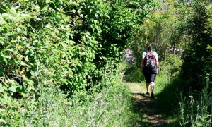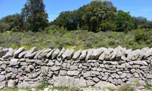 Monter à gauche, passer le dolmen, continuer sur 50 m, puis quitter la draille à droite par le passage aménagé dans le muret. Le sentier serpente dans la garrigue haute (bien suivre le balisage). Traverser la D 127, aller en face et atteindre une clairière. Descendre à gauche par le sentier bien ouvert. Emprunter la piste à droite sur 100m, puis s’engager à gauche sur le sentier qui passe sous la ligne électrique, puis sous le pont de la D 32. Parcourir le lit du ruisseau et atteindre une grande prairie.