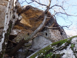 Tournez à gauche. Traverser deux ruisseaux, passer les ruines d’un ancien séchoir à châtaignes (sécadou) avant d’arriver aux habitations troglodytes.