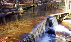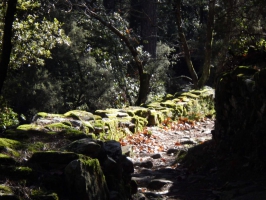 Se diriger à gauche sur 250 m. Descendre à droite par la voie romaine caladée. Elle dévale en lacets dans le vallon. Continuer la descente au-dessus du ruisseau du Thérondet et rejoindre une voie cimentée.