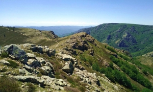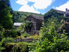 > Variante courte (11,5 km ; 3 h 30) : se diriger à droite et, plus loin dans les genêts, descendre jusqu’à un carrefour. Ignorer le chemin en face, suivre le sentier caillouteux et franchir un ruisseau. Descendre, rejoindre l’itinéraire principal et partir à droite (tirets sur la carte).2. Continuer en face, le sentier descend en lacets dans les châtaigniers. En bas, franchir un ruisseau sur un pont et entrer dans le hameau d’Héric.