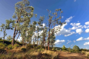 Emprunter le chemin de terre qui longe le bois de pins. à l’embranchement, bifurquer à droite et monter à travers une plantation d’eucalyptus.