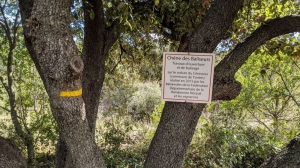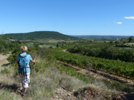 Avant le virage à droite (calvaire, jonction avec la D 174), quitter la route et monter à gauche par un chemin creux ceinturé de murs, dans les vignes. Au niveau d’une oliveraie, poursuivre la montée sous les chênes et rejoindre le plan du Céressou (207 m) ( point de vue sur la plaine viticole, le bord de mer, Agde et Sète par temps clair). Virer à gauche et poursuivre le sentier en balcon ( point de vue sur le village de Fontès). Plus loin, à gauche, amorcer la descente. Couper un sentier, descendre en face le sentier ombragé et, plus bas, continuer par une piste entre les vignes jusqu’au radier.