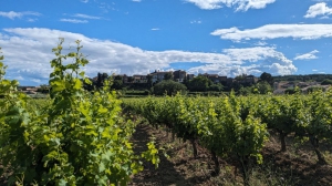 Traverser la départementale (prudence) et descendre à gauchedans la combe. Franchir un ruisseau, remonter et longer un champ à droite sur quelques centaines de mètres. Redescendre à droite en bout de champs, franchir à gué un ruisseau intermittent et continuer sur une piste en bordure de vignes, sous la route. Poursuivre tout droit et remonter en face sur la butte.