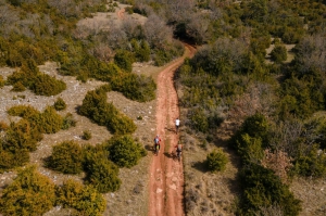Roulez sur cette passade en terre où vous rencontrerez deux passages de clôtures, après le second prenez à gauche, suivez à travers un espace assez roulant sur un terrain sans trop de végétation et sortez sur un chemin carrossable en prenant à droite jusqu'au portail en bordure de la D 9. Traversez et suivez de l'autre côté sur la droite la clôture. Prenez l'espace entre les 2 parcs en franchissant le portillon puis suivez le balisage sur un espace caillouteux et enherbé sur certaines parties jusqu'au prochain portillon.